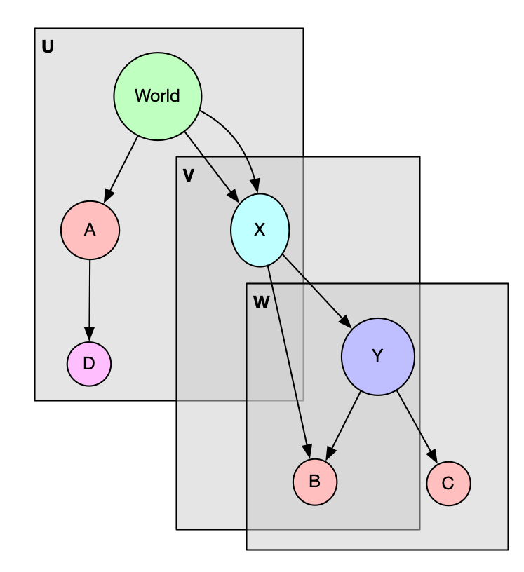 This geometry produces the volume hierarchy shown in Figure 2. Although there are four canonical volume levels, ORANGE converts the hierarchy into three universes (U, V, and W). Leaf volumes (i.e., those with no children) are inlined into the same universe as their parent, and single-use enclosures such as D are usually inlined as well.