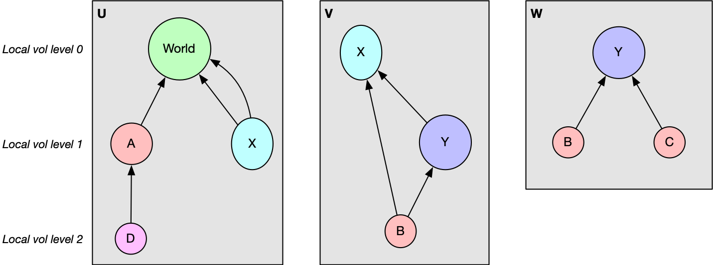 Fig. 3 Local impl volumes in each universe. Top nodes are true volumes; lower nodes represent inlined instances.¶
