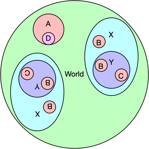 Consider a geometry with volumes World, A–D, X, and Y. Some of these volumes have multiple placements, and one instance of X also has a rotation. Figure 1 illustrates the overall geometry layout.